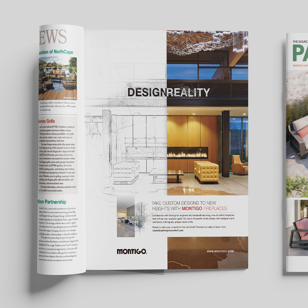 For Montigo Fireplaces, we decided to target architects and designers. The art director had a concept for showing a sketch as well as a finished product in one image. We then added to this idea with a Design/Reality tagline to go along with our visuals.