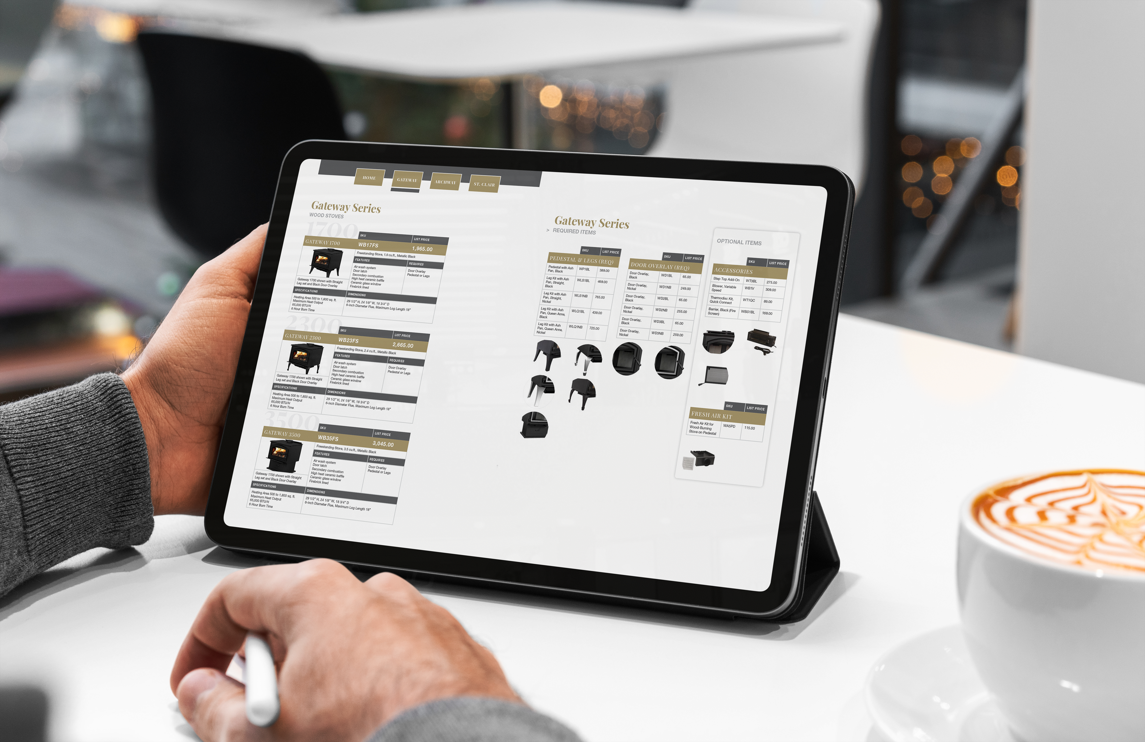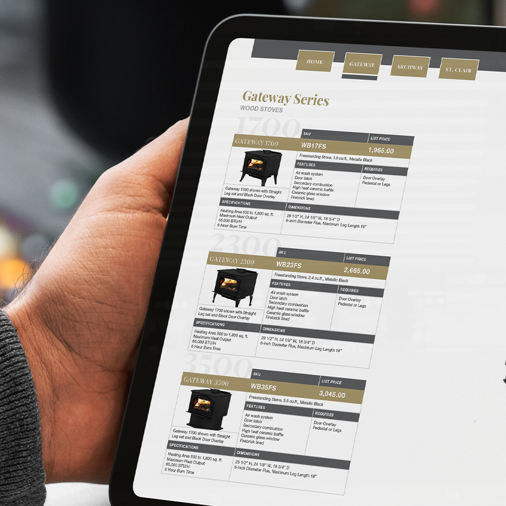 For Montigo Fireplaces, we designed the catalog specifically as a flippable document that a dealer can palm through alongside a customer. The buttons and visual elements help make the selling process more seamless and interactive.